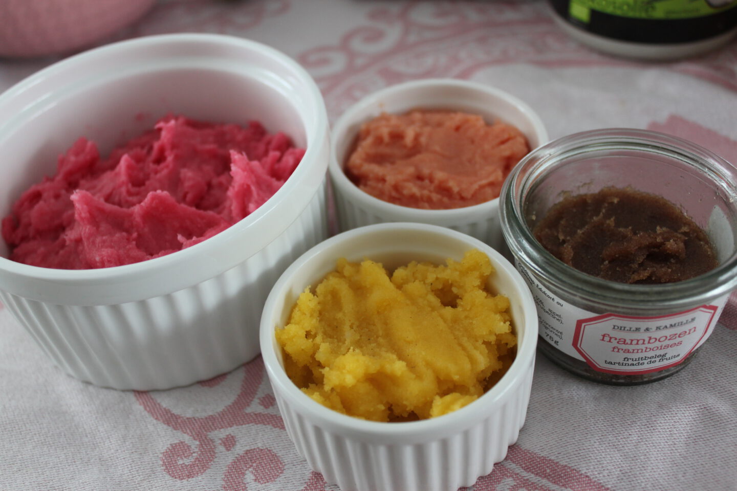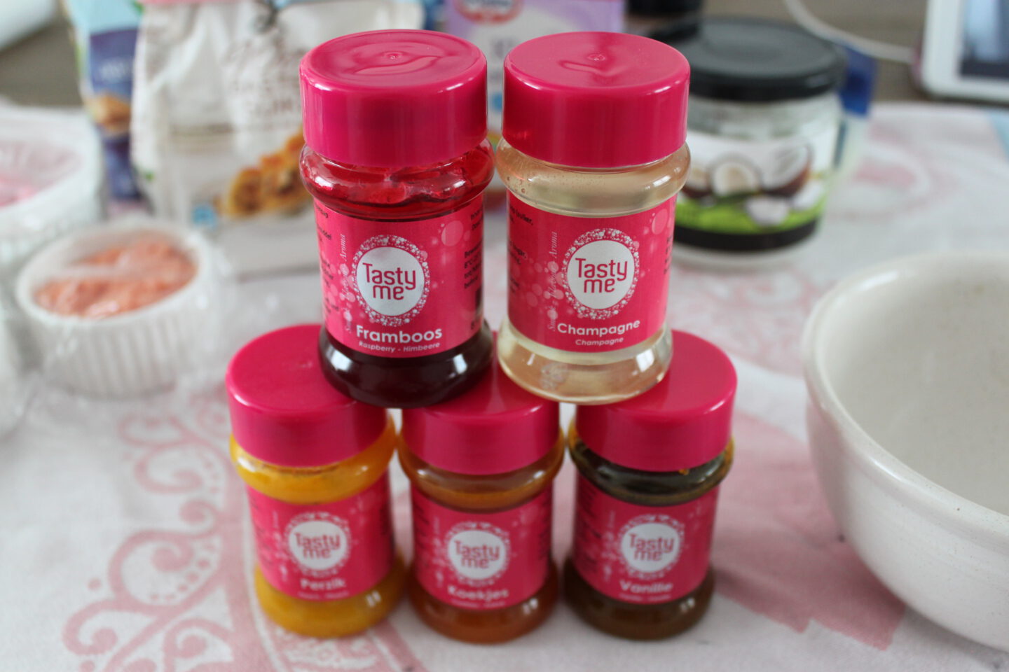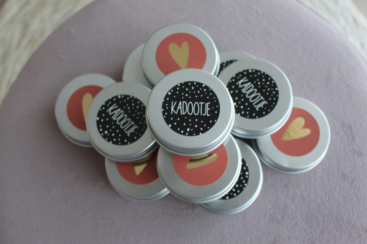 Ik heb vijf verschillende smaakstoffen besteld: vanille, perzik, koekjes, framboos en champagne. En een heleboel potjes en leuke stickers voor erop, zodat ik ook gelijk wat potjes kon maken voor vriendinnen. De aluminium potjes die ik heb besteld, deed me denken aan de potjes van Lush. Je kunt het natuurlijk ook in reispotjes doen of glazen potjes, wat je zelf handiger vindt.